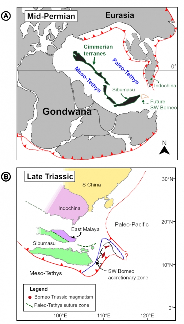 潘吉亚超大陆是地球历史上距离我们最近的超大陆。一般认为,潘吉亚超大陆开始于二叠纪冈瓦纳和劳亚大陆的拼合,三叠纪围绕最东端的东南亚大陆块体继续生长。然而,潘吉亚超大陆最终定型过程中,东南亚众多中小块体的汇聚过程仍然令人费解。究竟是外来陆块拼贴还是由原地增生主导?准确回答这个问题对理解单一大陆的形成以及大陆地壳的生长过程中起着至关重要的作用。